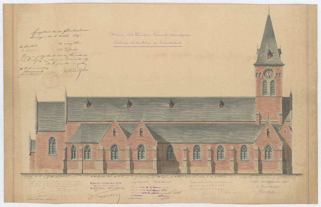 Opschrift: Provincie Oost-Vlaanderen. Gemeente Lovendegem. Ontwerp tot herstelling der parochiekerk. Omschrijving plan: opstand N-gevel Datum KCML: 07/03/1896 Archiefnummer: O0750