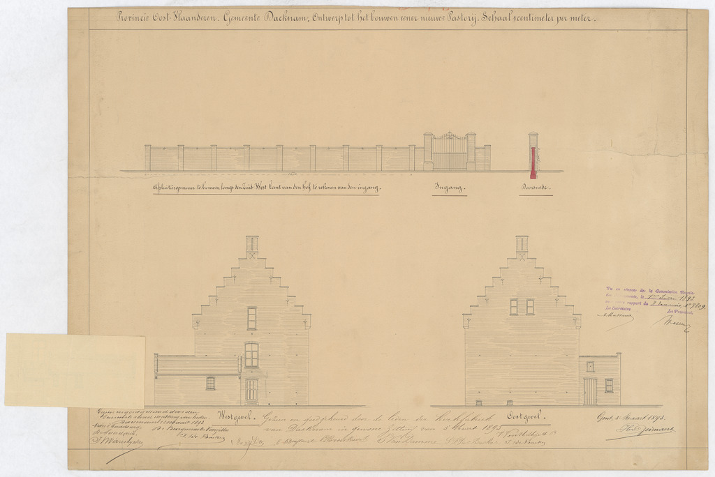 Opschrift: Provincie Oost-Vlaanderen. Gemeente Dacknam. Ontwerp tot het bouwen eener nieuwe pastorij. Omschrijving plan: opstanden zijgevels, vooraanzicht en doorsnede afsluitingsmuur Datum KCML: 01/07/1893 Archiefnummer: O0736_02