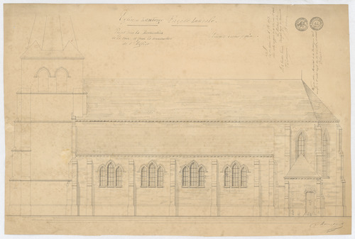 Opschrift: Eglise de Lemberge. Projet pour la restauration de la tour et pour la reconstruction de l'Eglise. Omschrijving plan: opstand zijgevel 1 Datum KCML: 06/09/1873 Archiefnummer: O0796