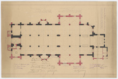 Opschrift: Provincie Oost-Vlaanderen. Gemeente Lovendegem. Ontwerp tot herstelling der parochiekerk. Omschrijving plan: plattegrond niveau 0 Datum KCML: 07/03/1896 Archiefnummer: O0747
