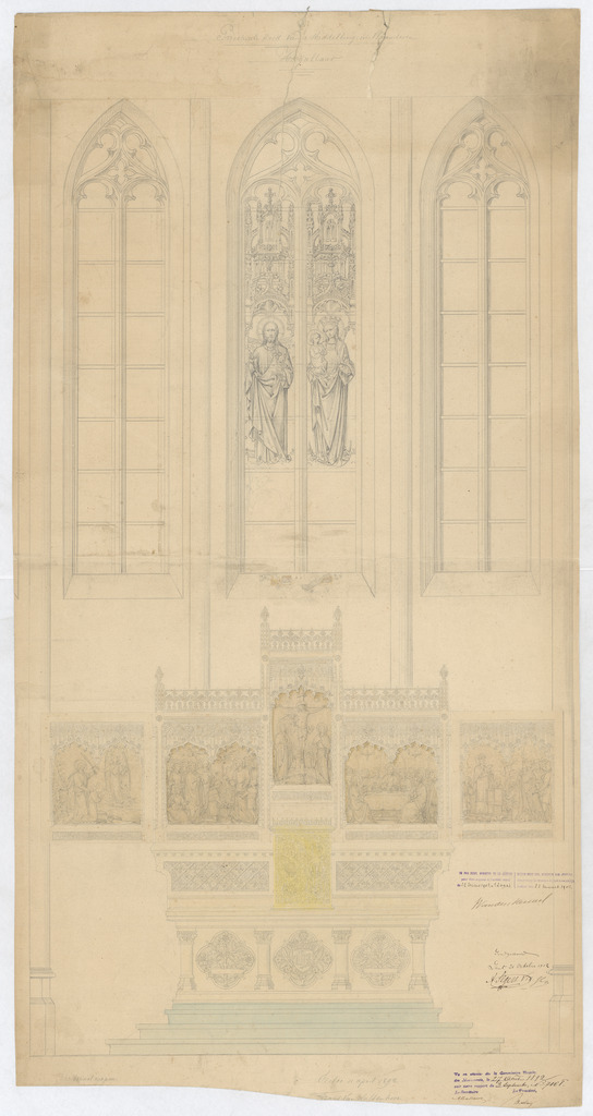 Opschrift: Parochiale kerk van Middelburg in Vlaanderen. Hoogaltaar Omschrijving plan: detailtekening hoogaltaar Datum KCML: 27/08/1892 Archiefnummer: O0782