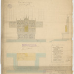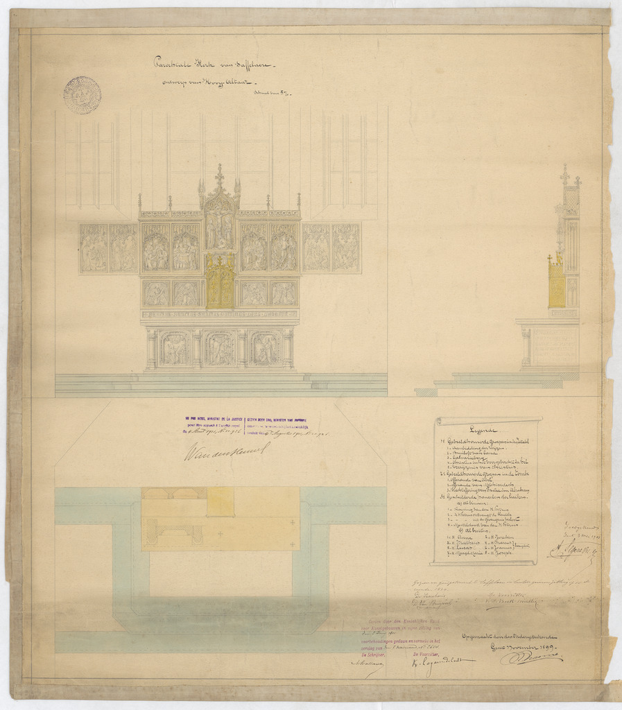 Opschrift: Parochiale kerk van Saffelaere. Ontwerp van hoogaltaar. Omschrijving plan: plattegrond, voor- en zijaanzicht hoogaltaar Datum KCML: 2-6-1900 Archiefnummer: O0711