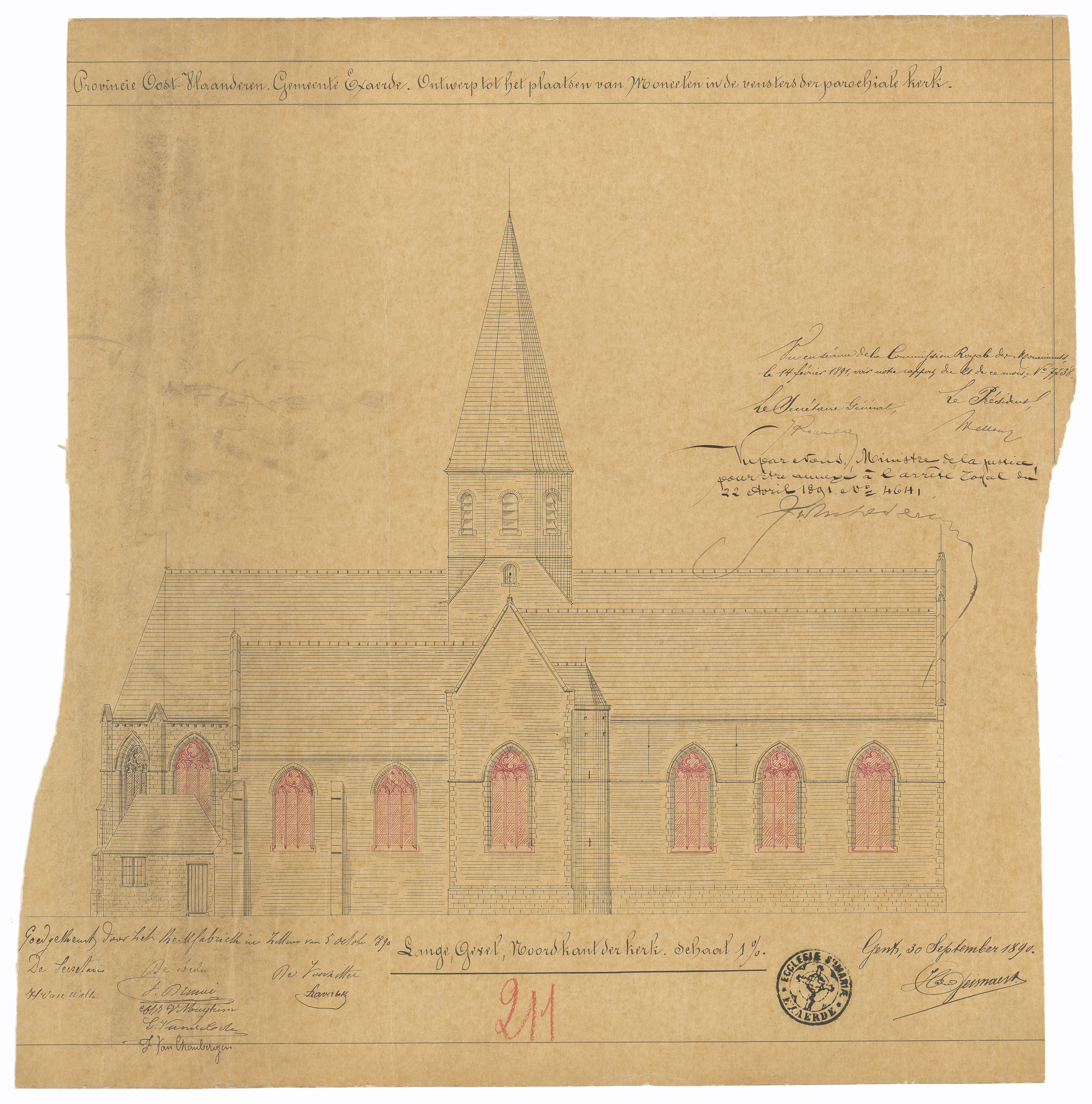 Opschrift: Provincie Oost-Vlaanderen. Gemeente Exaerde. Ontwerp tot het plaatsen van moneelen in de vensters der parochiale kerk. Omschrijving plan: opstand N-gevel Datum KCML: 14/02/1891 Archiefnummer: O0737