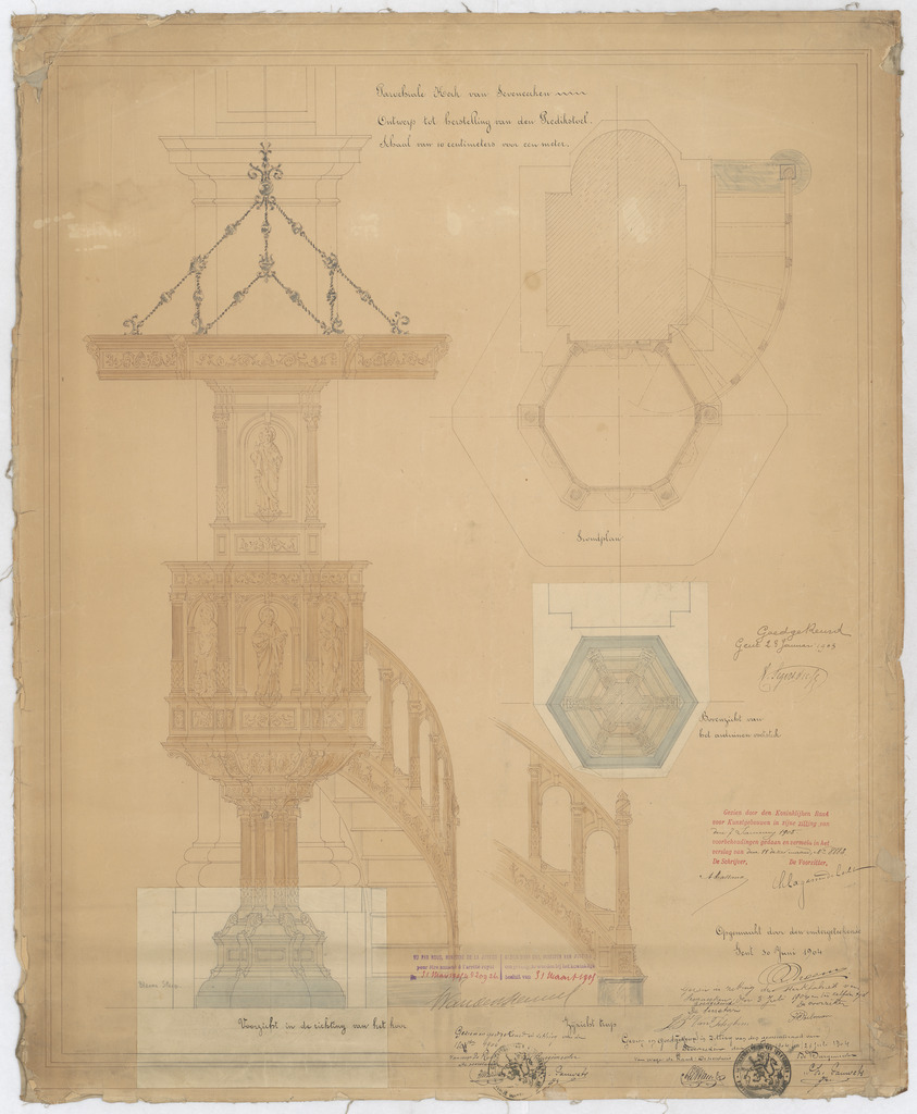 Opschrift: Parochiale kerk van Seveneecken. Ontwerp tot herstelling van den predikstoel Omschrijving plan: vooraanzicht en plattegrond preekstoel Datum KCML: 7-1-1905 Archiefnummer: O0721