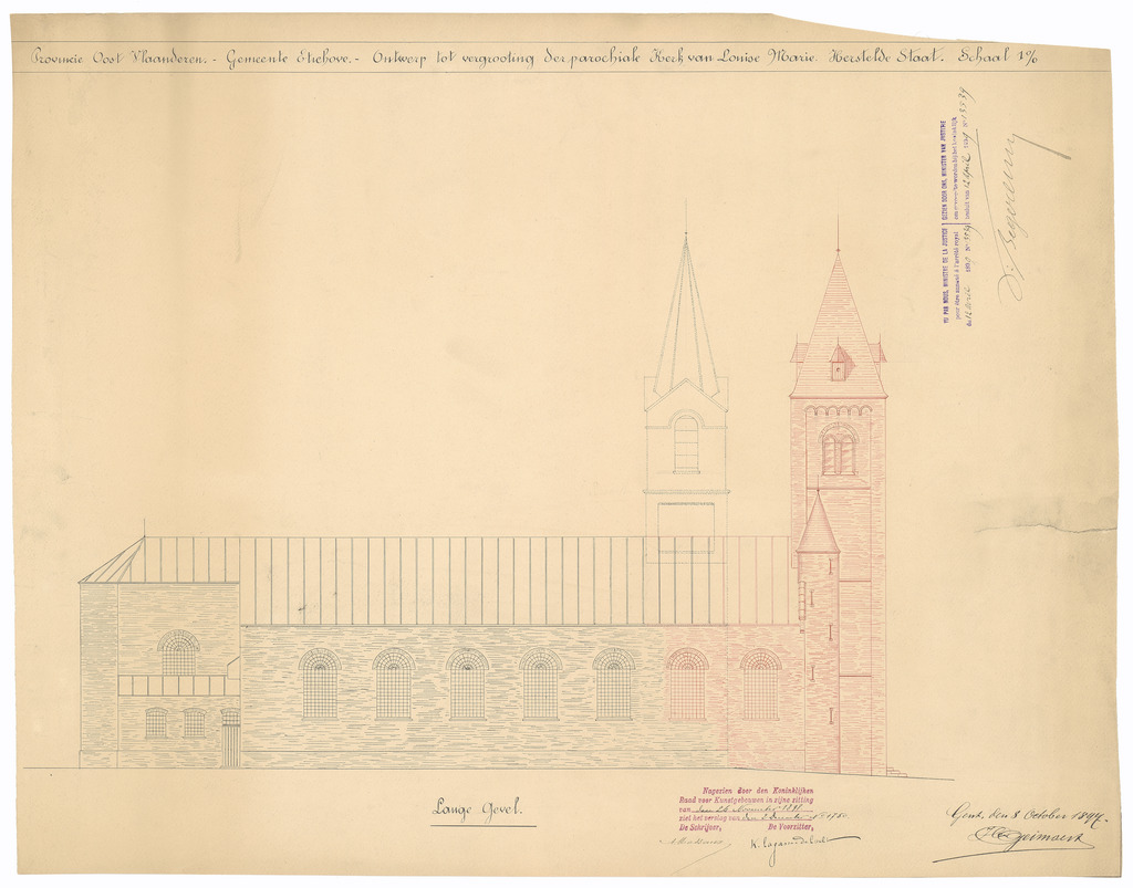 Opschrift: Provincie Oost-Vlaanderen. Gemeente Etichove. Ontwerp tot vergrooting der parochiale Kerk van Louise Marie - Herstelde Staat. Omschrijving plan: opstand zijgevel 1 Datum KCML: 26/11/1898 Archiefnummer: O0763