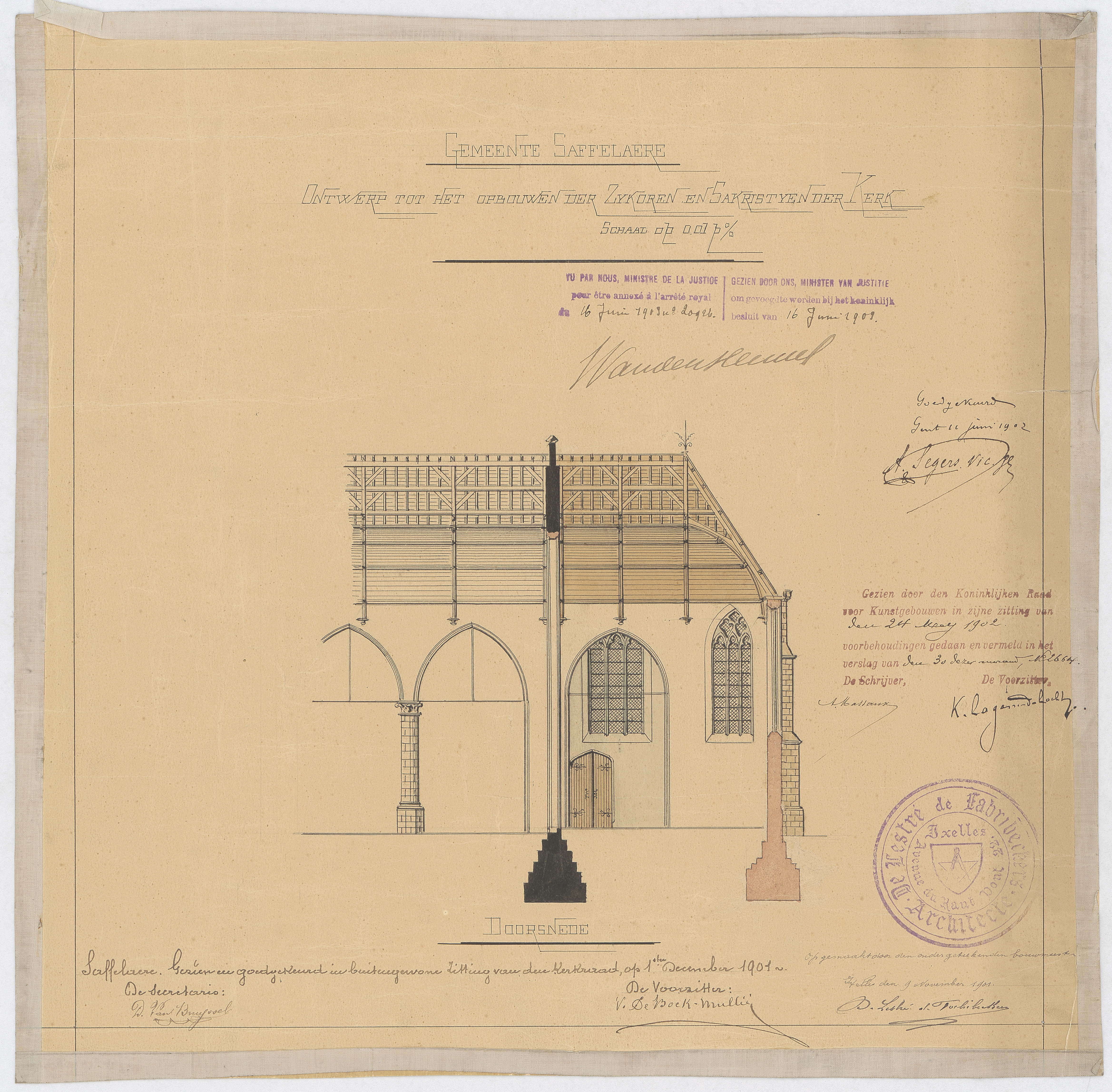 Opschrift: Gemeente Saffelaere. Ontwerp tot heropbouwen der zijkoren en sakristyen der kerk. Omschrijving plan: langsdoorsnede Datum KCML: 24-5-1902 Archiefnummer: O0704