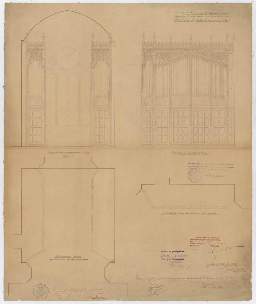 Opschrift: Parochiale kerk van den H.Petrus te Saffelaere. Ontwerp tot het maken van orgelbeschotten. Omschrijving plan: plattegrond, voor- en zijaanzicht orgelkast Datum KCML: 30-5-1908 Archiefnummer: O0717