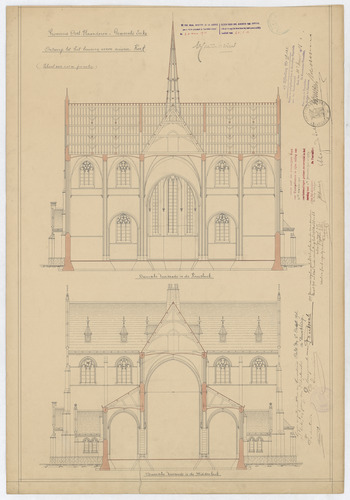 Opschrift: Provincie Oost-Vlaanderen - Gemeente Eecke. Ontwerp tot het bouwen eener nieuwe Kerk. Omschrijving plan: dwarsdoorsnede, dwarsdoorsnede op de kruisbeuk en op de middenbeuk Datum KCML: 30-12-1910 Archiefnummer: O0832