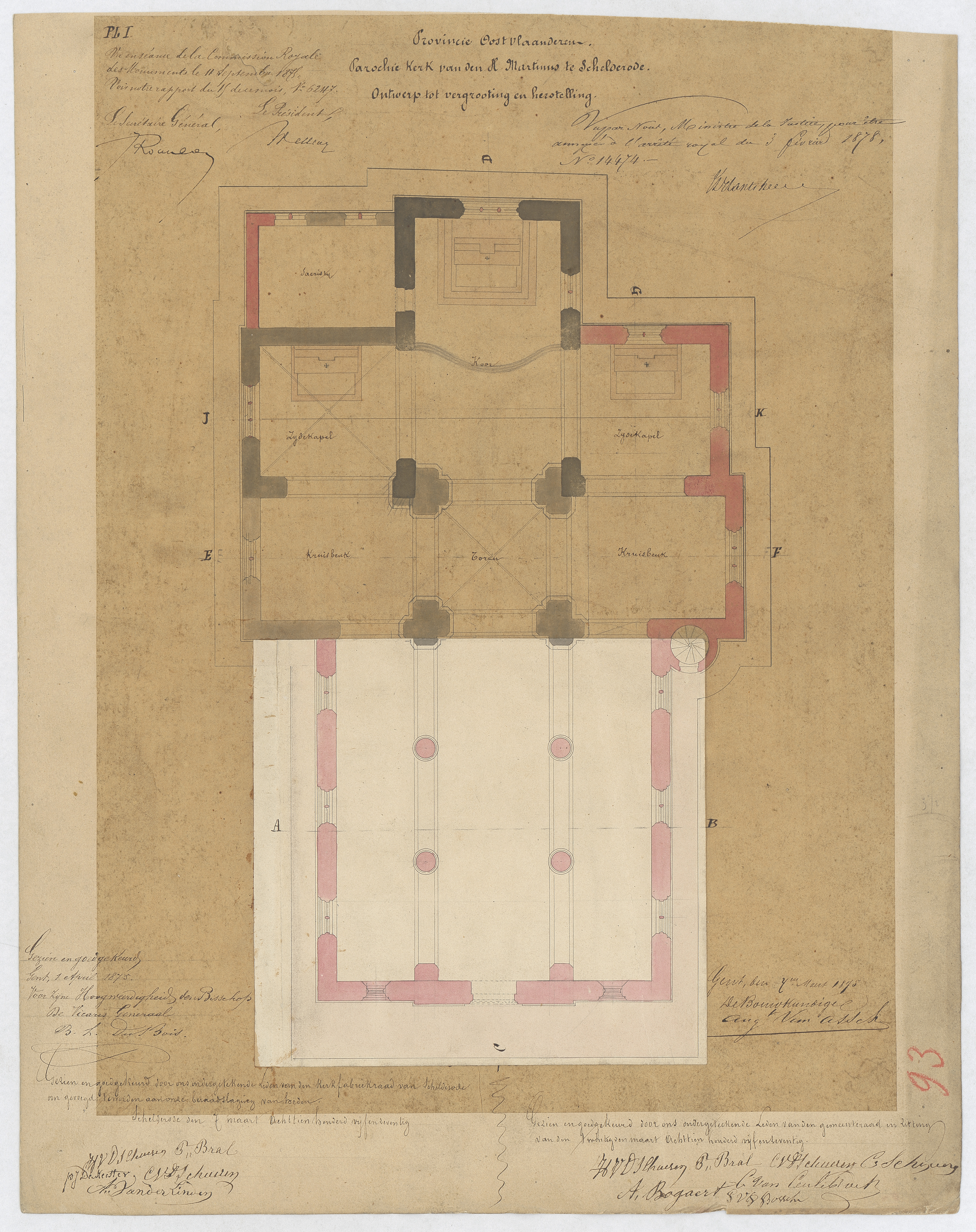 Opschrift: Provincie Oost-Vlaanderen. Parochie Kerk van den H.Martinus te Schelderode. Ontwerp tot vergrooting en herstelling. Omschrijving plan: plattegrond niveau 0 Datum KCML: 11/09/1875 Archiefnummer: O0806