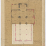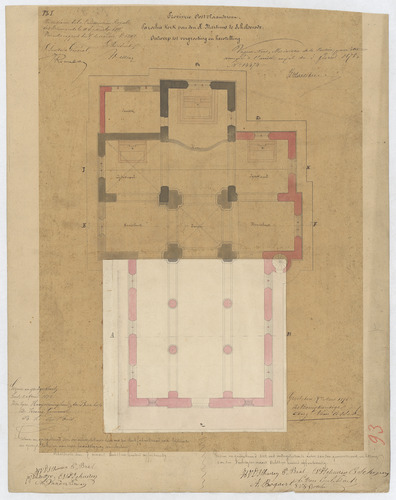 Drager: kalk op papier Techniek: pen, opgehoogd met aquarel. Aanpassing opgekleefd Afmetingen (h x b in mm): 357 x 450 mm Schaal: deze informatie wordt niet vermeld op het archiefstuk