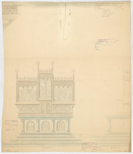 Opschrift: Ontwerp vanhoogaltaar. Nieuwe kerk van Moerbeke Kruisstraat Omschrijving plan: voor- en zijaanzicht hoogaltaar Datum KCML: 23-5-1908 Archiefnummer: O0821