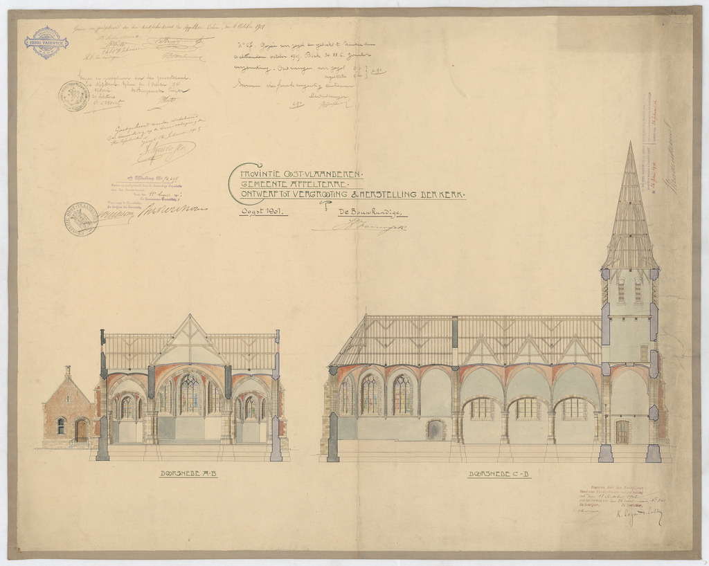 Opschrift: Provincie Oost-Vlaanderen. Gemeente Appelterre. Ontwerp tot vergrooting & herstelling der kerk. Omschrijving plan: dwars- en langsdoorsnede Datum KCML: 18-10-1902 Archiefnummer: O0898