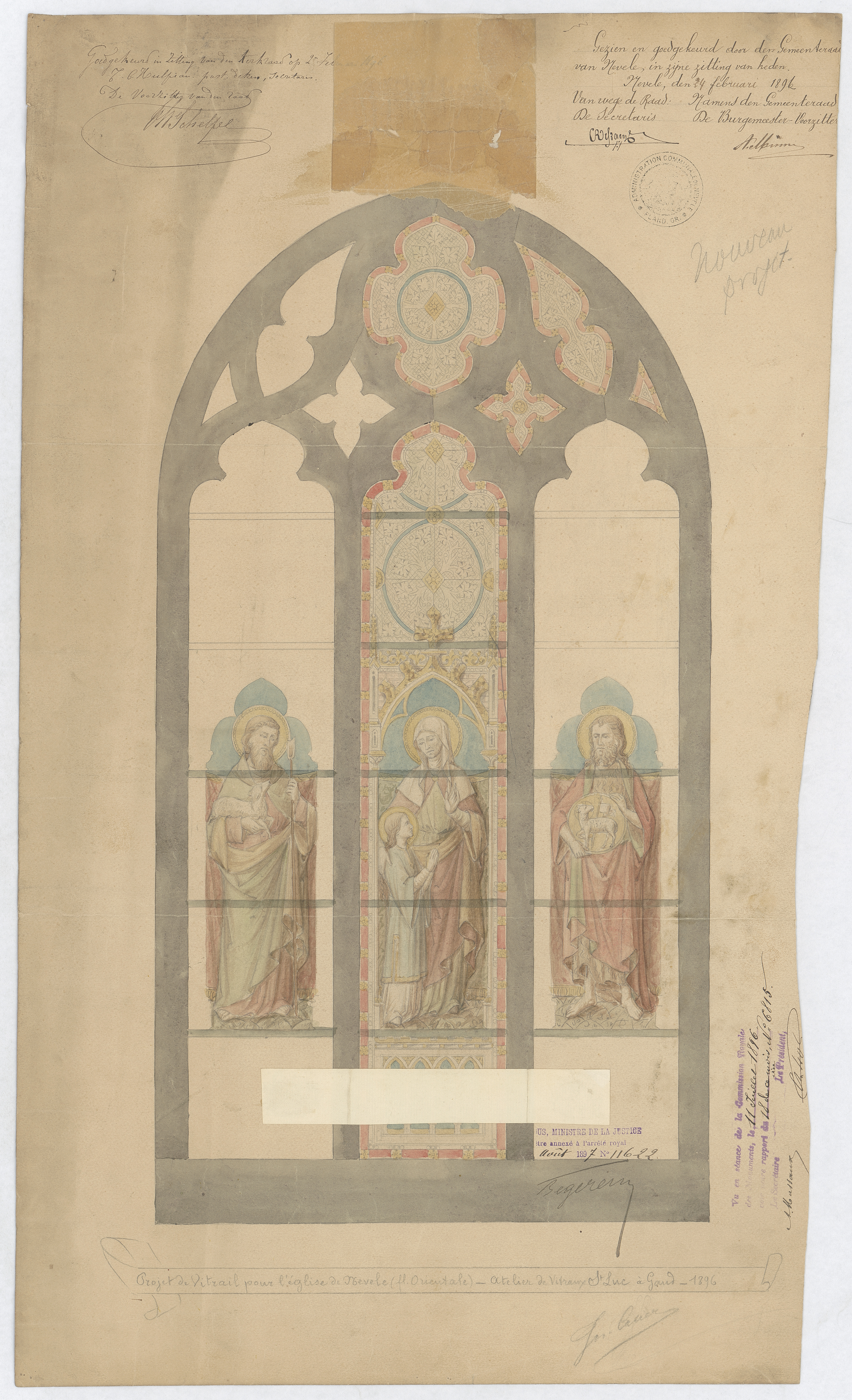 Opschrift: Projet de vitrail pour l'église de Nevele (Fl. Orientale) - Atelier de Vitraux St.Luc à Gand. Omschrijving plan: detailtekening glasraam Datum KCML: 11/07/1896 Archiefnummer: O0835_02
