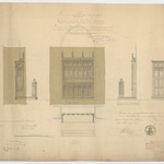 Opschrift: Province de Flandre Orientale. Commune de Vosselaere. Projet de mobilier pour l'eglise paroissiale. Stalles du choeur. Omschrijving plan: plattegrond, voor- en zijaanzicht koorgestoelte (aangepast ontwerp) Datum KCML: 11-10-1902 Archiefnummer: O0884_01