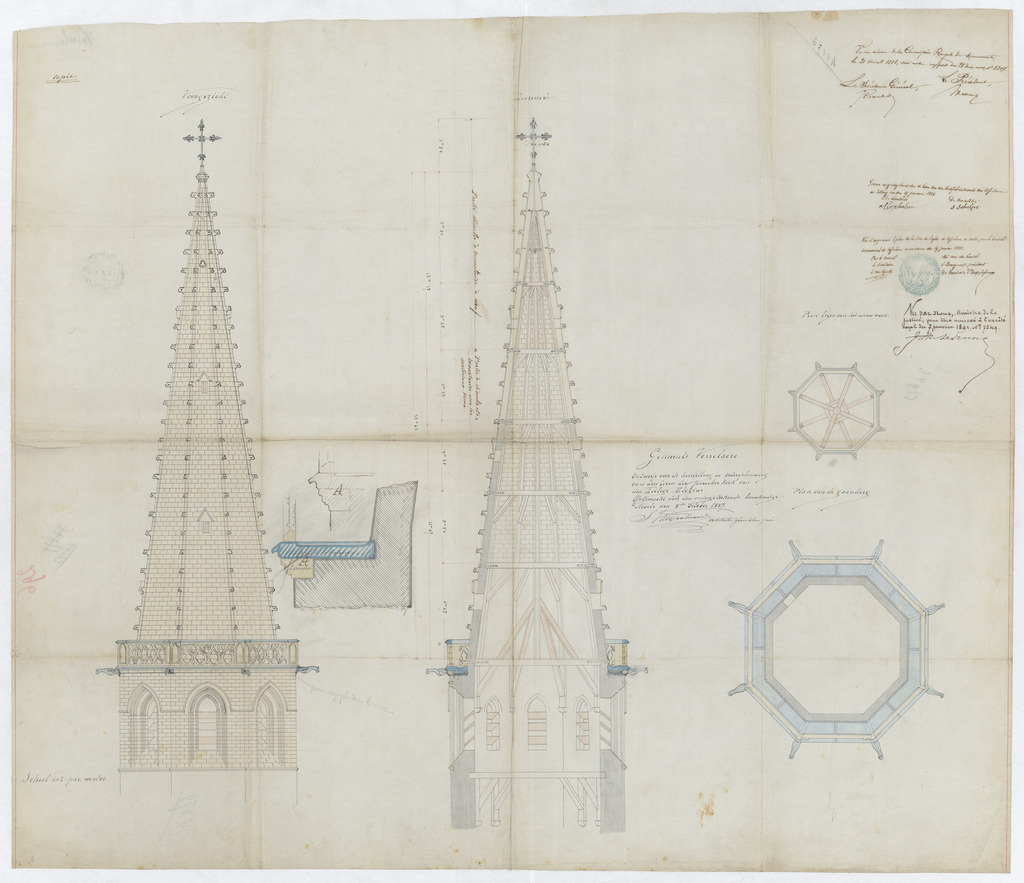 Opschrift: Gemeente Vosselaere. Ontwerp voor de herstelling en werderopbouwing van den toren der parochiekerk van den Heilige Eligius. Omschrijving plan: opstand, plattegrond, doorsnede en detail toren Datum KCML: 21/04/1888 Archiefnummer: O0889