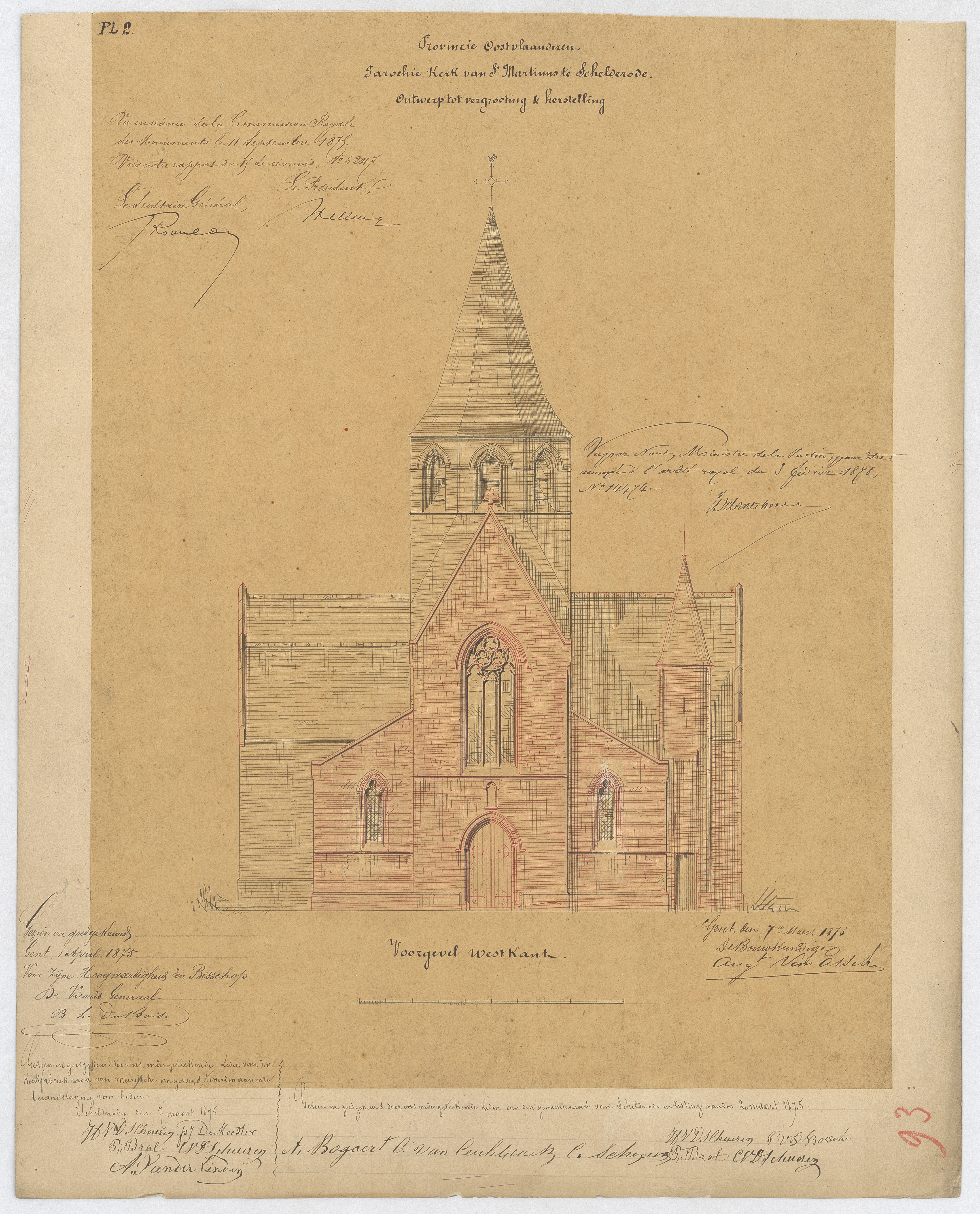Opschrift: Provincie Oost-Vlaanderen. Parochie Kerk van den H.Martinus te Schelderode. Ontwerp tot vergrooting en herstelling. Omschrijving plan: opstand voorgevel Datum KCML: 11/09/1875 Archiefnummer: O0807