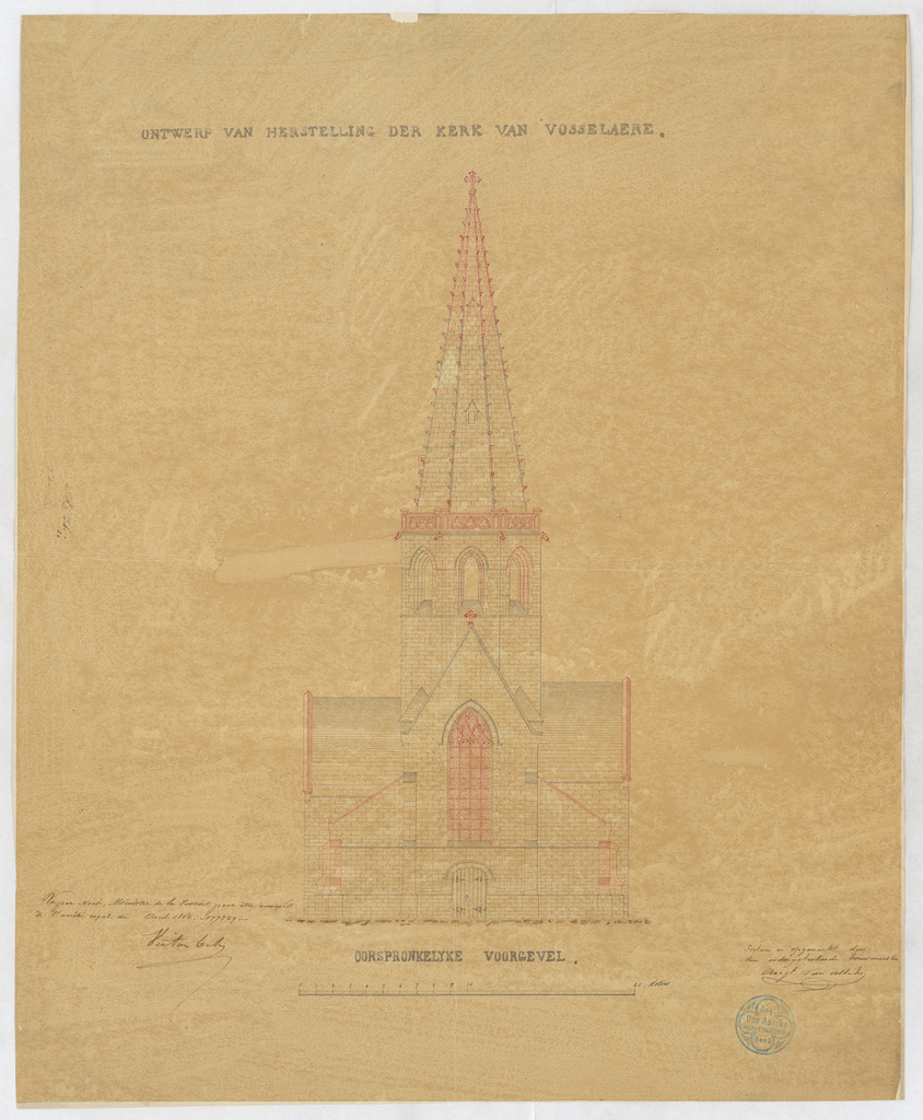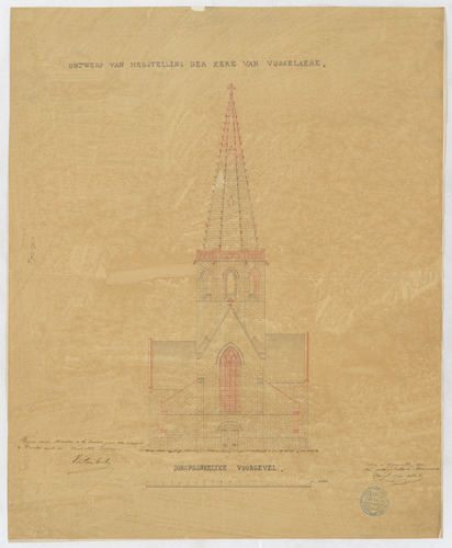 Opschrift: Ontwerp van herstelling der kerk van Vosselaere. Omschrijving plan: opstand voorgevel, oorspronkelijke toestand Datum KCML: deze informatie wordt niet vermeld op het archiefstuk Archiefnummer: O0863
