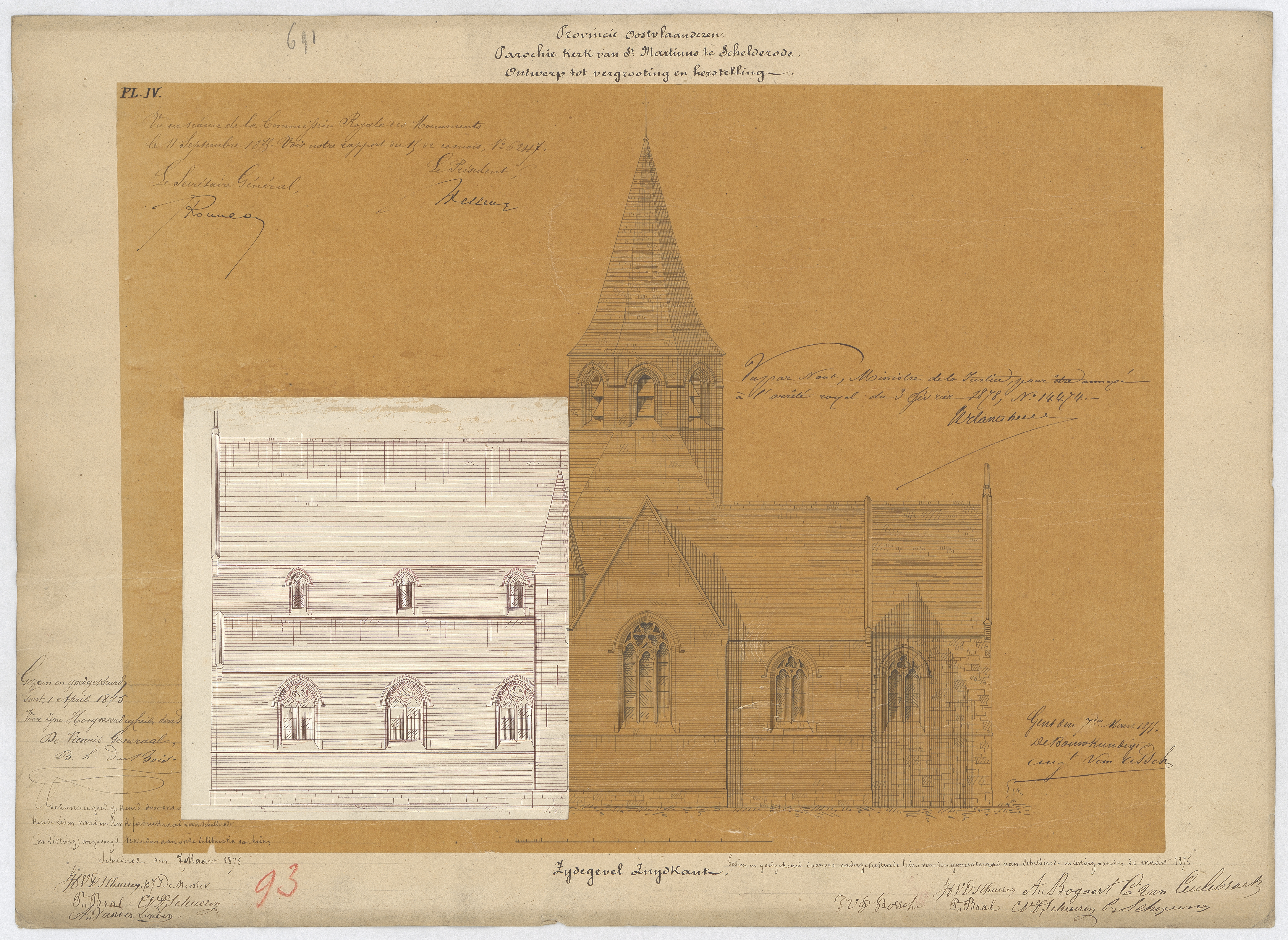 Opschrift: Provincie Oost-Vlaanderen. Parochie Kerk van den H.Martinus te Schelderode. Ontwerp tot vergrooting en herstelling. Omschrijving plan: opstand Z-gevel Datum KCML: 11/09/1875 Archiefnummer: O0809