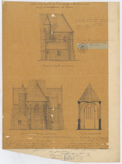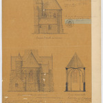 Opschrift: Eglise paroissiale de St.-Christophe à Scheldewindeke. Projet de restauration du choeur. Omschrijving plan: opstand zuidelijke zijgevel, opstand achtergevel en dwarsdoorsnede Datum KCML: 15/04/1876 Archiefnummer: O0930
