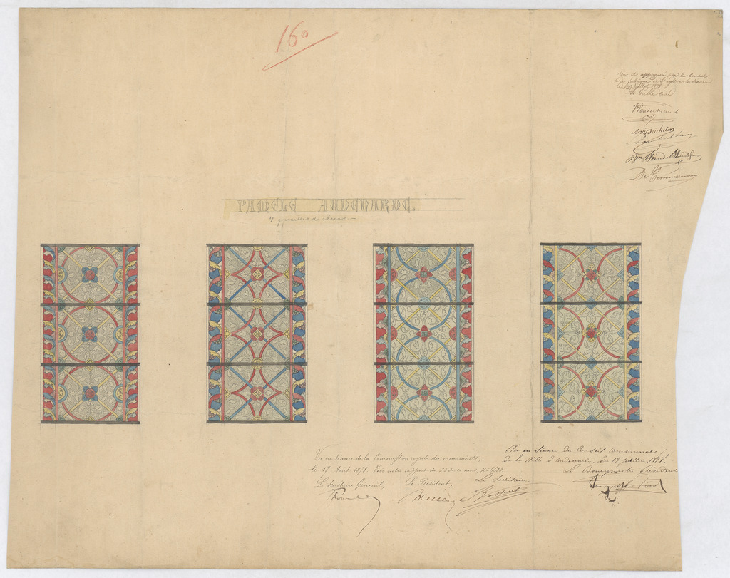 Opschrift: Pamele. Audenarde. 4 grisailles du choeur Omschrijving plan: ontwerp glasraam Datum KCML: 17/08/1878 Archiefnummer: O0958
