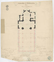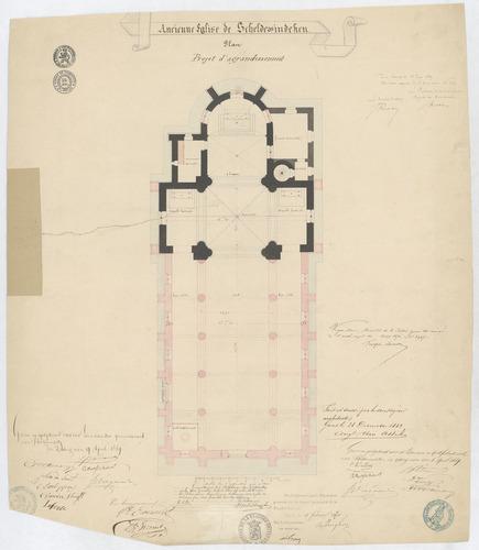 Opschrift: Ancienne église de Scheldewindeken. Projet d'agrandissement. Omschrijving plan: plattegrond niveau 0 Datum KCML: 12/06/1869 Archiefnummer: O0932