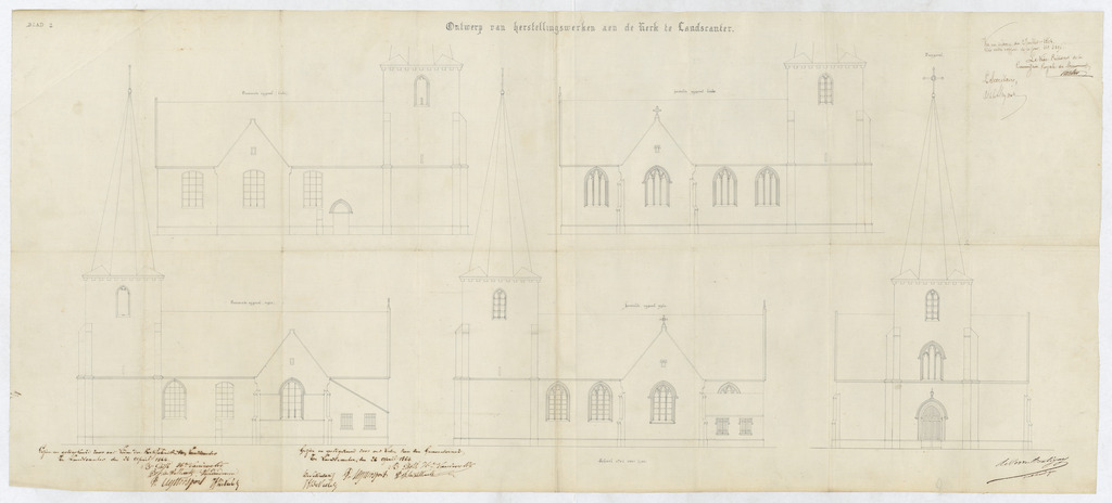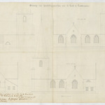 Opschrift: Ontwerp van herstellingswerken aen de Kerk te Landscauter Omschrijving plan: opstand voorgevel en zijgevels Datum KCML: 02/07/1864 Archiefnummer: O0918