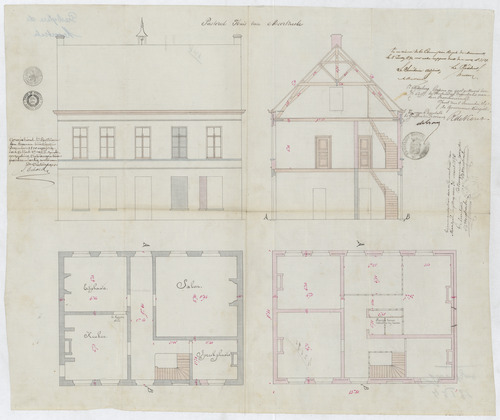 Opschrift: Pastoreel huis van Moortzeele Omschrijving plan: plattegronden, opstand voorgevel en doorsnede Datum KCML: 05/07/1890 Archiefnummer: O0928