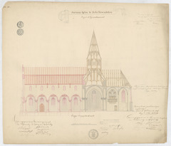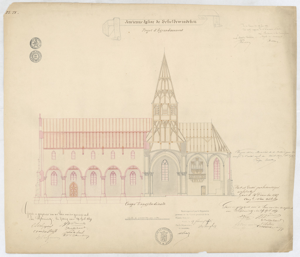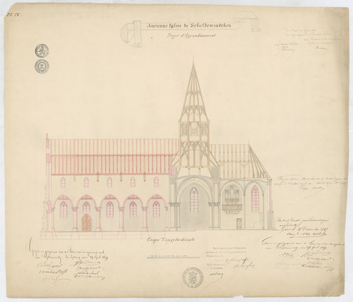 Opschrift: Ancienne église de Scheldewindeken. Projet d'agrandissement. Omschrijving plan: langsdoorsnede Datum KCML: 12/06/1869 Archiefnummer: O0937
