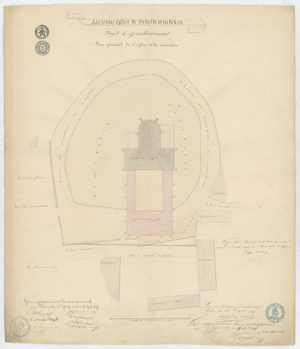Opschrift: Ancienne église de Scheldewindeken. Projet d'agrandissement. Plan général de l'église et du cimetière. Omschrijving plan: situatieplan Datum KCML: deze informatie wordt niet vermeld op het archiefstuk Archiefnummer: O0931