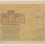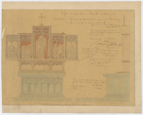 Opschrift: Eglise de Notre Dame de Pamele à Audenarde. Autel dédié à Notre Dame du Mont Carmel à placer dans les chapelles latérales du côté sud construites au XVIième siècle. Omschrijving plan: ontwerp zijaltaar O.-L.Vrouw van de Carmel Datum KCML: 21/03/1885 Archiefnummer: O0964