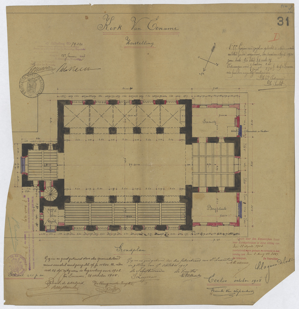 Opschrift: Kerk van Eename. Herstelling Omschrijving plan: plattegrond niveau 0 Datum KCML: 28-4-1906 Archiefnummer: O0995