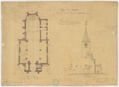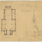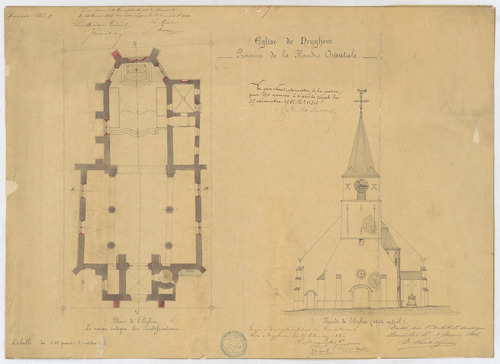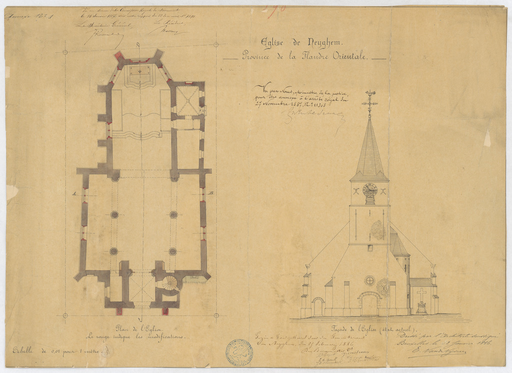 Opschrift: Eglise de Neyghem. Province de la Flandre Orientale. Omschrijving plan: plattegrond en opstand voorgevel huidige toestand Datum KCML: 15/01/1887 Archiefnummer: O0902