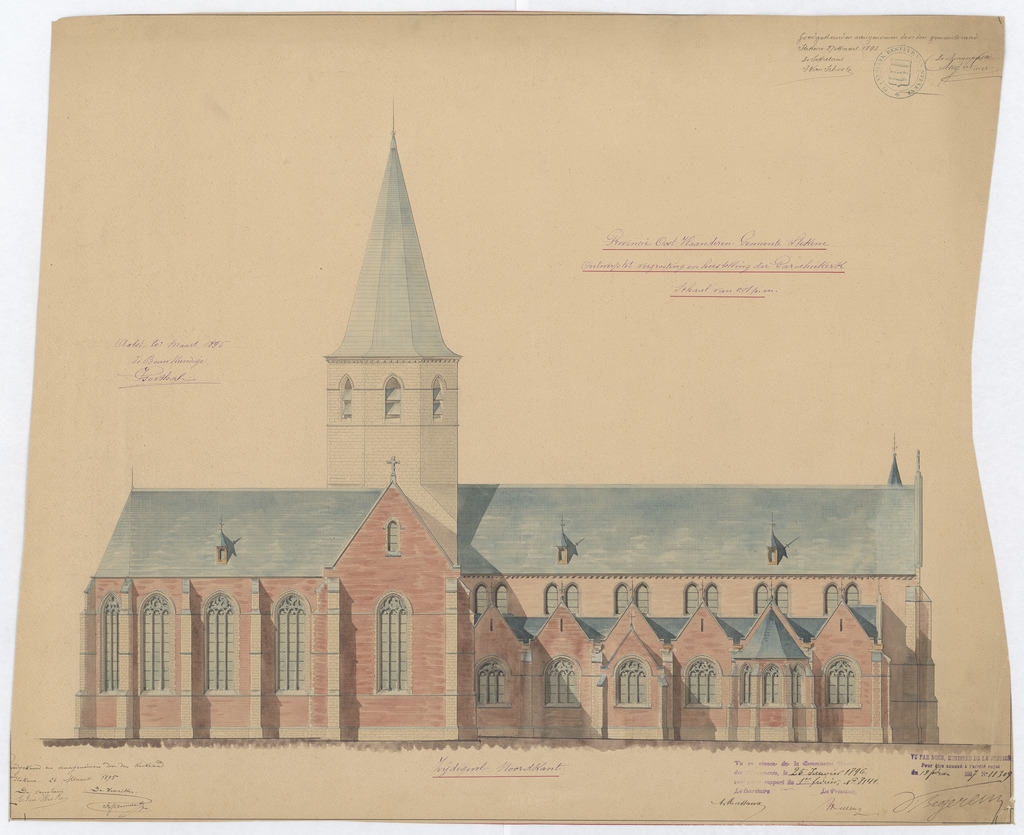 Opschrift: Provincie Oost-Vlaanderen. Gemeente Stekene. Ontwerp tot vergrooting en herstelling der Parochiekerk. Omschrijving plan: opstand N-gevel Datum KCML: 25/01/1896 Archiefnummer: O1194