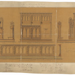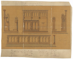 Opschrift: Eglise de Mariakerke lez Gand. Nouveau Mobilier du Choeur. Omschrijving plan: voor- en zijaanzicht en doorsnede van koorgestoelte, vooraanzicht communiebank Datum KCML: deze informatie wordt niet vermeld op het archiefstuk Archiefnummer: O1775