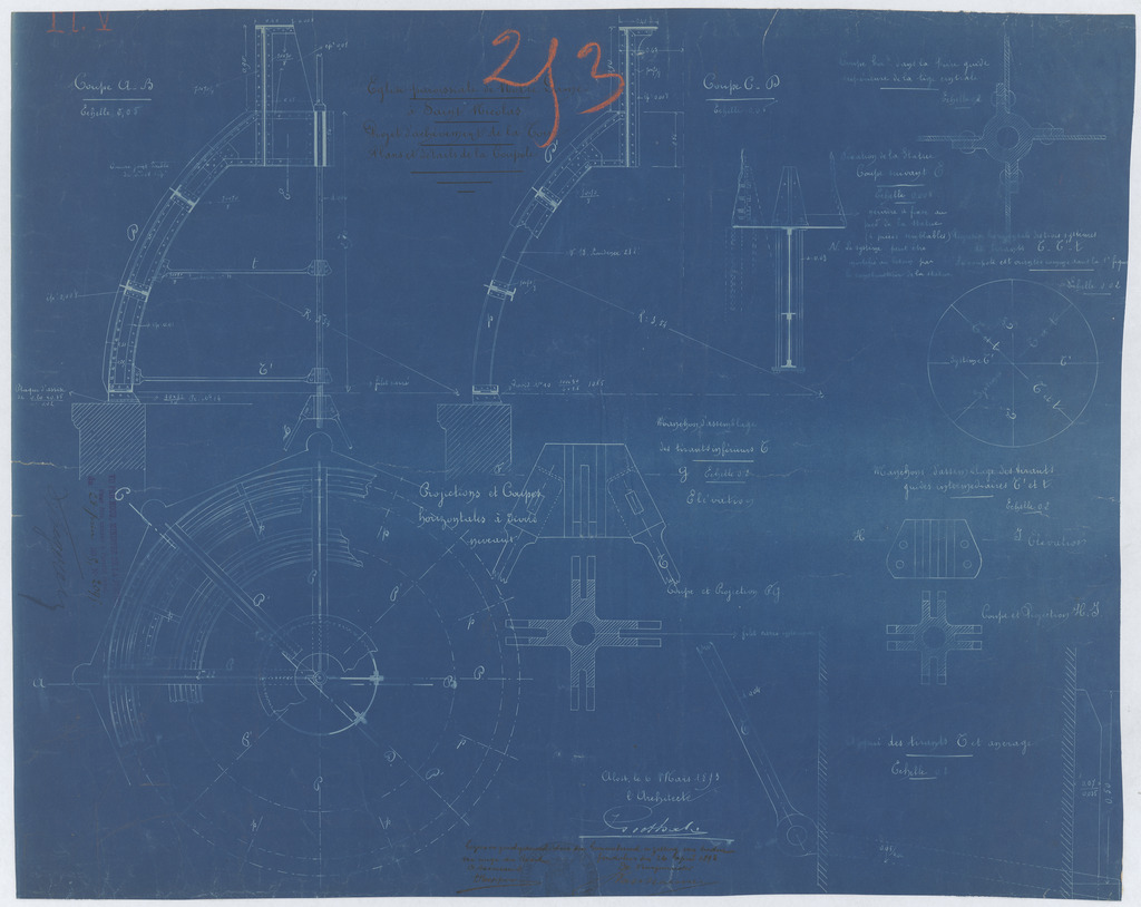 Opschrift: Eglise paroissiale de Notre-Dame à Saint Nicolas. Projet d'achèvement de la Tour. Plans et details de la coupole. Omschrijving plan: detailtekeningen koepel Datum KCML: deze informatie wordt niet vermeld op het archiefstuk Archiefnummer: O1124