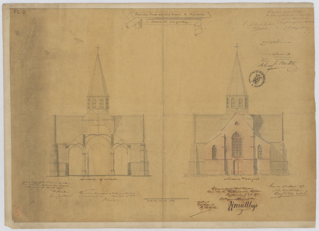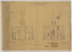 Opschrift: Parochiekerk van O.L.Vrouw te Hofstade. Ontwerp tot vergrooting. Omschrijving plan: opstand voorgevel, dwarsdoorsnede nieuwe toestand Datum KCML: 24/08/1872 Archiefnummer: O0067