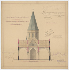 Opschrift: Provincie Oost-Vlaanderen - Gemeente Borsbeke. Ontwerp tot vergrooting en herstelling der parochiekerk. Omschrijving plan: dwarsdoorsnede, doorsnede op C-D Datum KCML: 19/06/1897 Archiefnummer: O0555