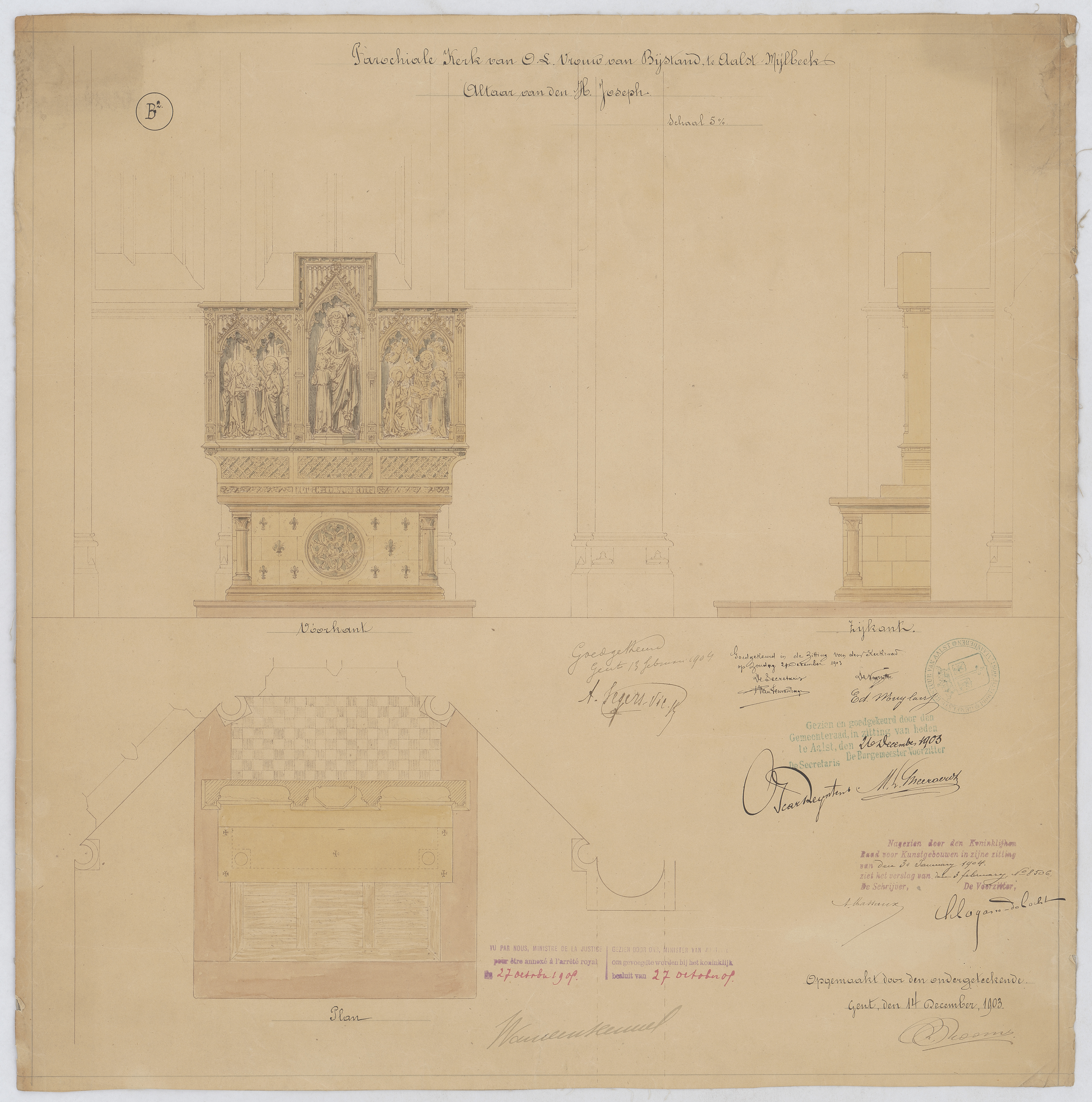Opschrift: Parochiale kerk van O.L.Vrouw van Bijstand te Aalst Mijlbeek. Altaar van den H. Joseph. Omschrijving plan: altaar van H.-Jozef: voor- en zijaanzicht en plattegrond Datum KCML: 30/01/1904 Archiefnummer: O0026