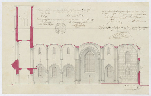 Drager: doek Techniek: pen, opgehoogd met rode inkt en potlood Afmetingen (h x b in mm): 315 x 494 mm Schaal: 1/100
