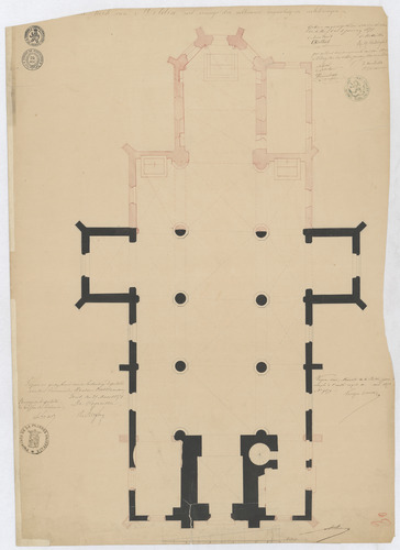 Opschrift: ...kerk van Melden met aanwijs der uittevoeren vergrooting en verbeteringen. Omschrijving plan: plattegrond niveau 0 Datum KCML: deze informatie wordt niet vermeld op het archiefstuk Archiefnummer: O1011