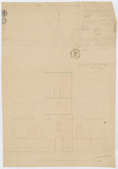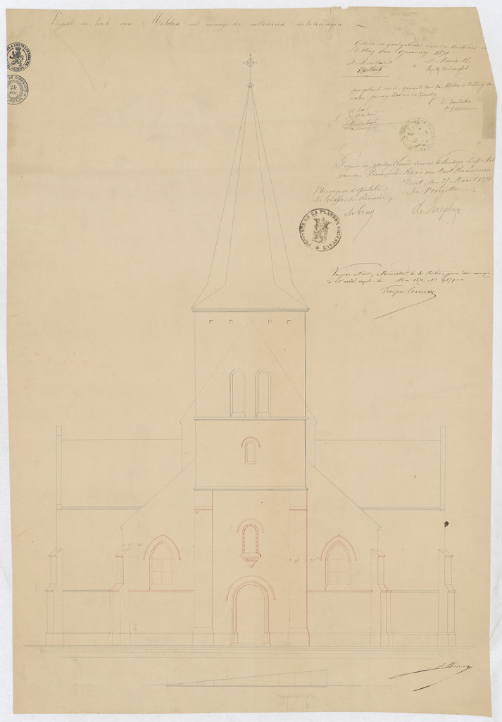 Opschrift: voorgevel der kerk van Melden met aanwijs der uittevoeren verbeteringen Omschrijving plan: opstand voorgevel Datum KCML: deze informatie wordt niet vermeld op het archiefstuk Archiefnummer: O1012