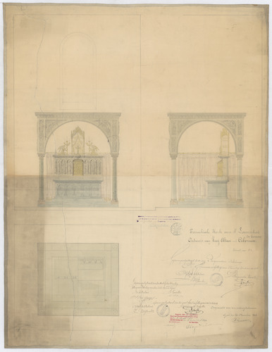 Opschrift: Parochiale Kerk van St. Laurentius te Eenaeme. Ontwerp van Hoog-Altaar met Ciborium. Omschrijving plan: ontwerp hoogaltaar met ciborium Datum KCML: 20/03/1909 Archiefnummer: O1002