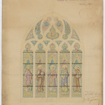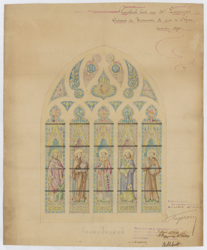 Opschrift: Parochiale kerk van St. Laureyns. Ontwerp der Zuidvenster A rond de choor. Omschrijving plan: detail glasraam Datum KCML: 08/05/1897 Archiefnummer: O1083