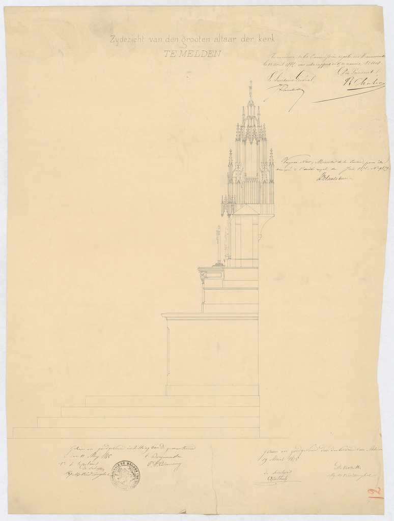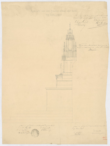 Opschrift: Zijdezicht van den grooten altaar der kerk. Omschrijving plan: ontwerp hoogaltaar Datum KCML: 13/04/1875 Archiefnummer: O1017