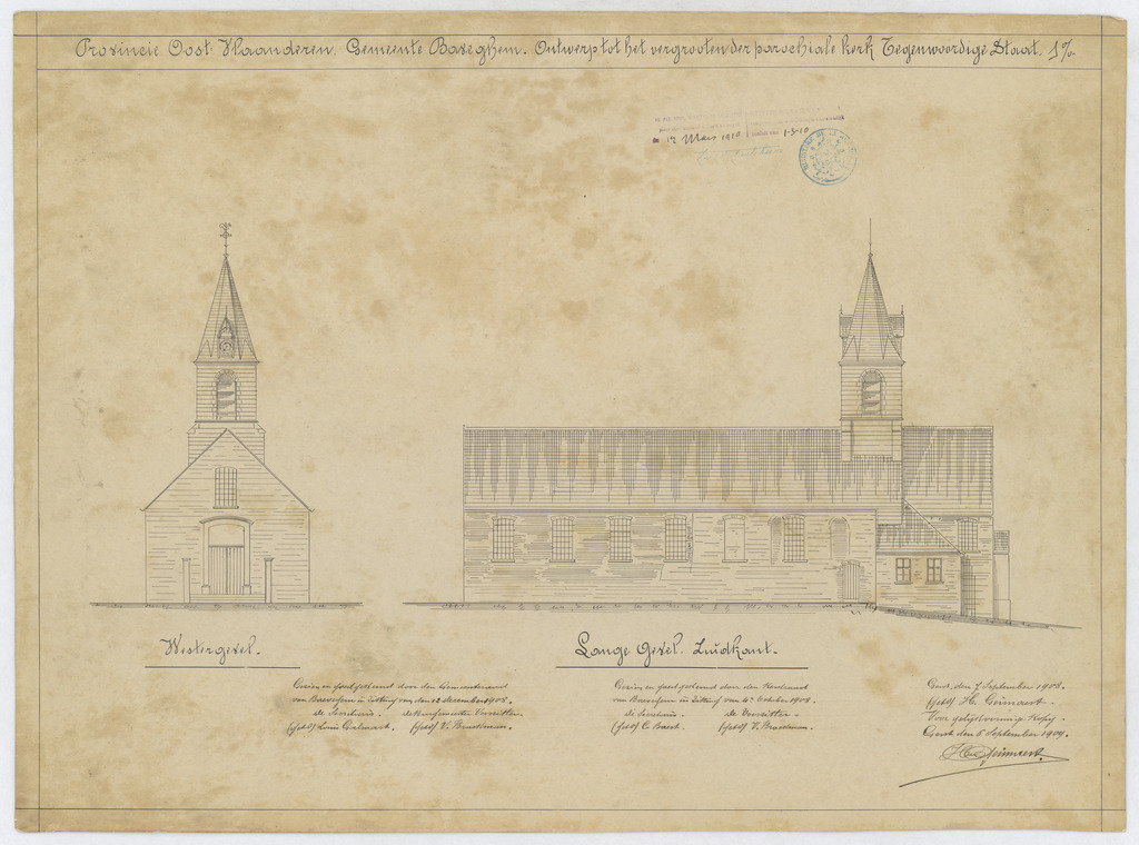 Opschrift: Provincie Oost-Vlaanderen. Gemeente Baveghem. Ontwerp tot het vergrooten der parochiale kerk. Tegenwoordige staat. Omschrijving plan: opstand west- en zuidgevel Datum KCML: deze informatie wordt niet vermeld op het archiefstuk Archiefnummer: O1093