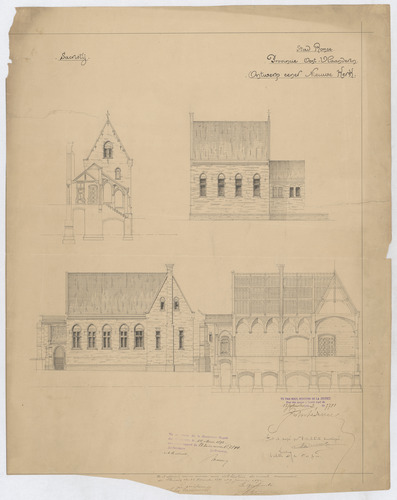 Opschrift: Stad Ronse. Provincie Oost-Vlaanderen. Ontwerp eener Niewe Kerk Omschrijving plan: opstanden en doorsneden sacristie Datum KCML: 14/05/1892 Archiefnummer: O1046
