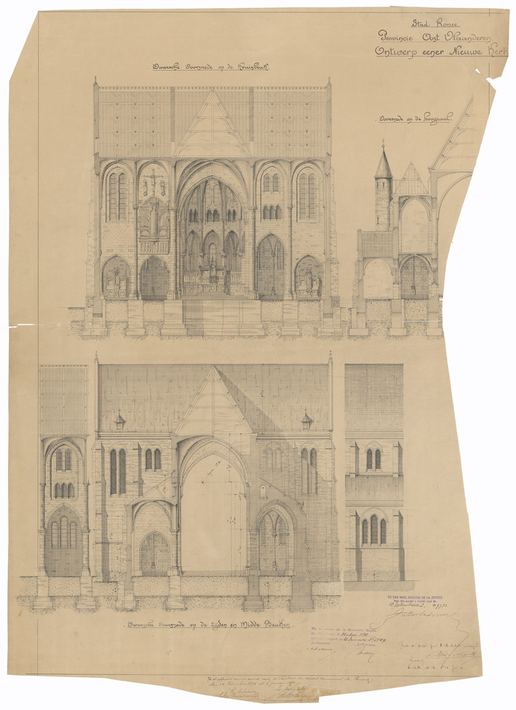 Opschrift: Stad Ronse. Provincie Oost Vlaanderen. Ontwerp eener Nieuwe Kerk. Omschrijving plan: dwarsdoorsnede Datum KCML: 14/05/1892 Archiefnummer: O1045