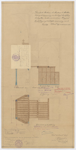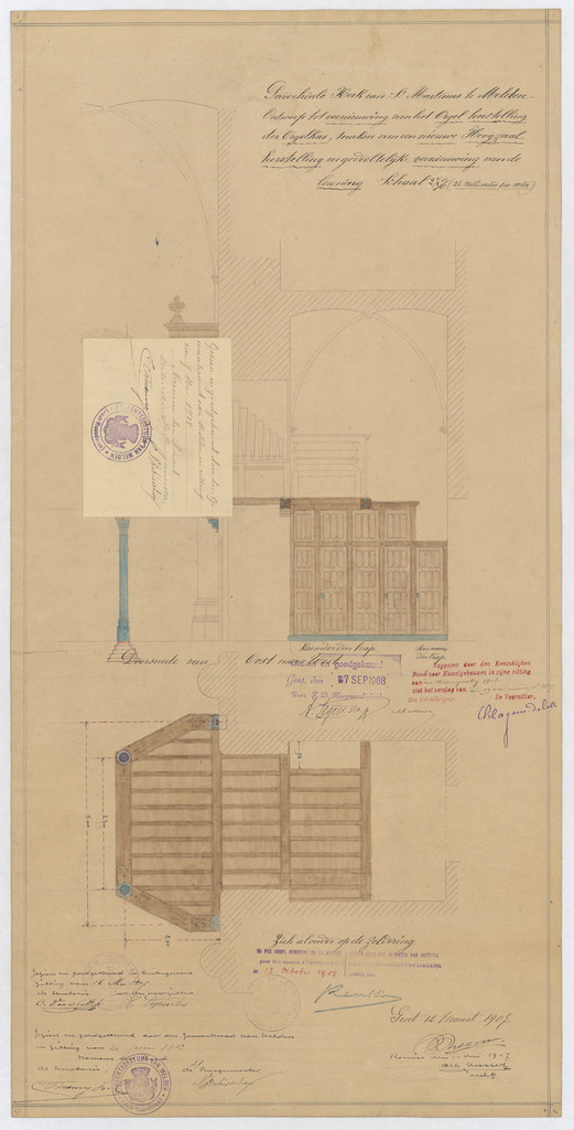 Opschrift: Parochiale Kerk van St. Martinus te Melden. Ontwerp tot vernieuwing van het orgel; herstelling der orgelkas; maken van eene nieuwe Hoogzaal; herstelling en gedeeltelijke vernieuwing van de leuning. Omschrijving plan: ontwerp doksaal en orgelkast Datum KCML: 14-8-1908 Archiefnummer: O1020_02