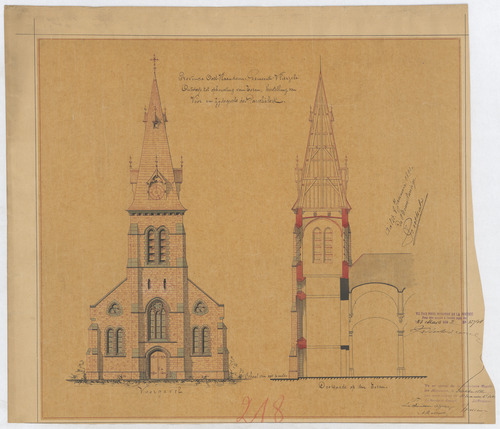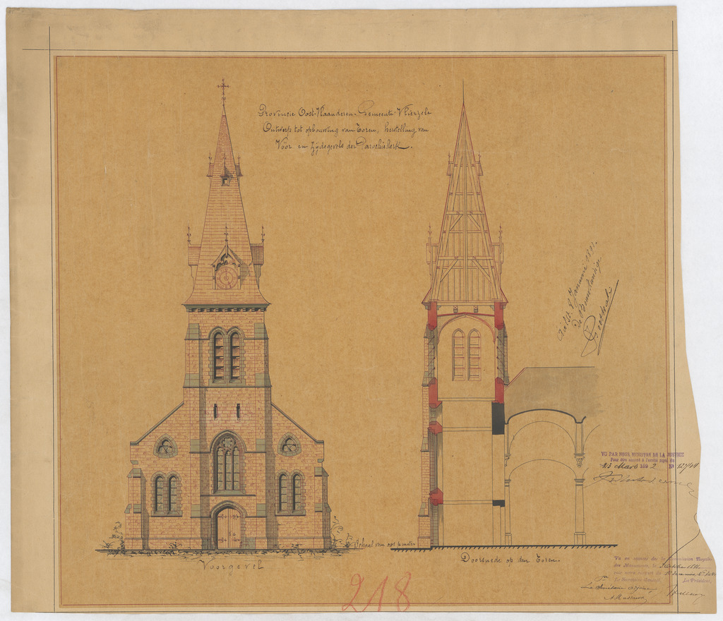 Opschrift: Provincie Oost-Vlaanderen. Gemeente Vlierzele. Ontwerp tot opbouwing van toren, herstelling van voor en zijdegevels der parochiekerk. Omschrijving plan: opstand voorgevel en doorsnede Datum KCML: 03/10/1891 Archiefnummer: O1110