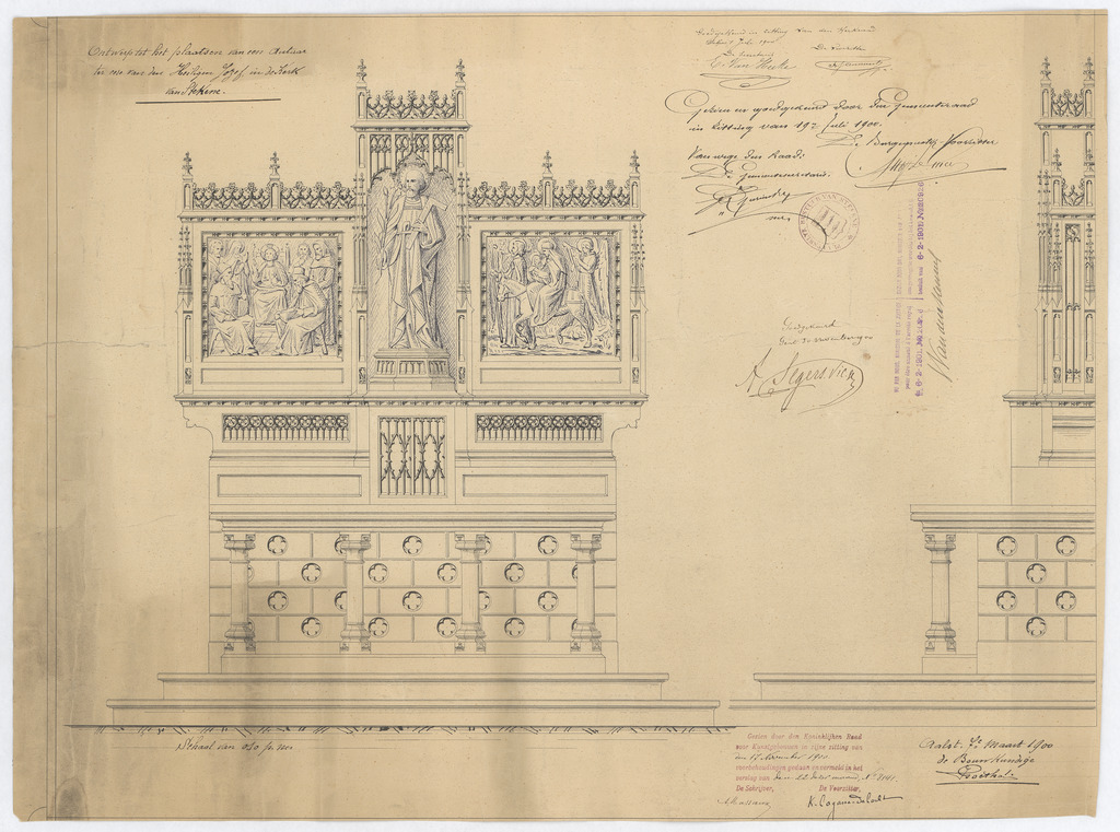 Opschrift: Ontwerp tot het plaatsen van een Autaar ter eere van den Heiligen Jozef, in de Kerk van Stekene. Omschrijving plan: voor- en zijaanzicht zijaltaar H. Jozef Datum KCML: 17/11/1900 Archiefnummer: O1200
